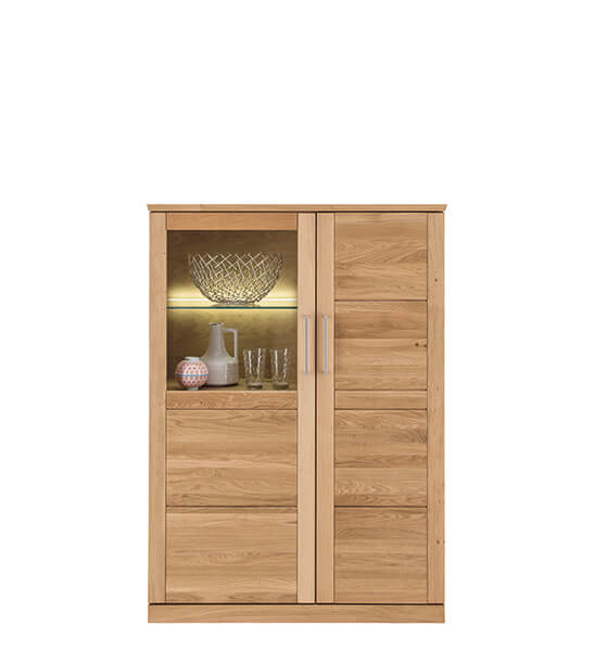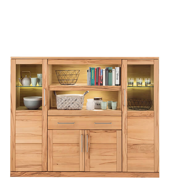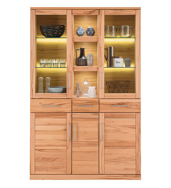Rund um die Essgruppe aus Esszimmertisch und Stühlen ergänzen weitere Möbel die Esszimmer-Einrichtung. Und diese Esszimmer-Serie bietet eine große Vielfalt an unterschiedlich hohen und breiten Vitrinenschränke, Highboards, Sideboards und Multi-Vertiko. Ihnen allen sind die wunderschöne, filigrane Maserung der Kernbuche, die schlichten Griffe und die hochwertige Verarbeitung gemeinsam. Und die Vitrinen, High- und Sideboards und die Buffetschränke bieten jede Menge Stauraum für Geschirr, Gläser und Kleinigkeiten wie Servietten, Kerzen oder Fondue-Sets.