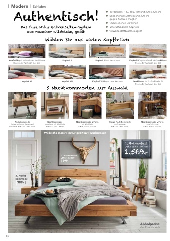 Wildeiche massiv, natur geölt mit Wuchsrissen B/H/T: 45 x 40 x 33 cm: | 389.- | PU-Leder-Polsterkopfteil, aufwendig gesteppt, Lgfl.: 180 x 200 cm: | 1.879.- |