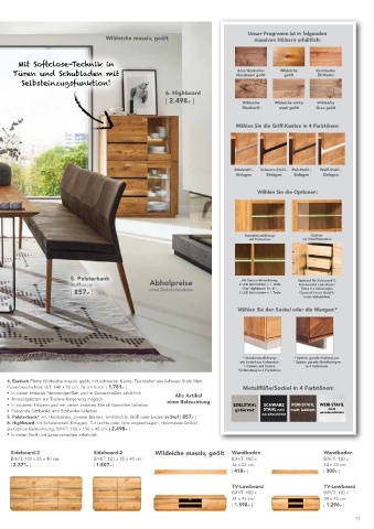 als Option Beleuchtung, 6. Highboard mit Schwarzstahl-Einlagen, Tür rechts oder links angeschlagen, Holzmassiv-Sockel,