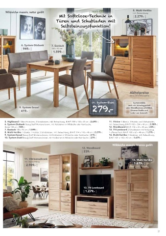 | 1.129.- | Multi-Vertiko 9. System-Sessel Bezug Stoff Montana brown, mit Holzbeinen in Wildeiche oder Kernbuche: | 419.- | 14. Multi-Vertiko 2 Holztüren, inkl. Beleuchtung,