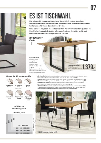 Unser Programm ist in folgenden massiven Hölzern erhältlich: Wählen Sie die Kantenprofile: 1. System-Esstisch Wildeiche massiv, bianco geölt, feste Platte mit abgerundeter Schweizer Kante,