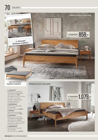 B/H/T: 45 x 43 x 35 cm: | je 339.- | 7. Nachtkommode Wildeiche massiv, natur geölt, mit 1 Schublade und runden Holzfüßen, B/H/T: 45 x 41 x 33 cm: | je 339.- | * Alle Betten ohne Rahmen und Auflagen.